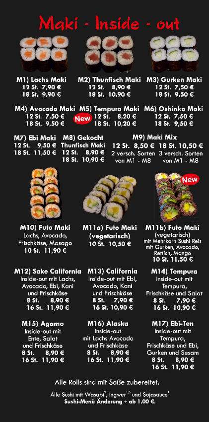 …Dann sind Sie hier genau richtig, wir zeigen wie Ihnen die Zubereitung gelingt. In Kombination mit einer Menge Spaß können Sie sich in Form einer Gruppe mit mindestens vier Teilnehmern telefonisch anmelden. Natürlich dürfen Sie zwischendurch jederzeit Ihr Sushi verkosten und können dies mit nach Hause nehmen.