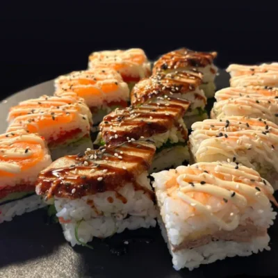 M40b) Oshi Sushi – Aal & Surimi & Wakame — mit Unagi-Sauce